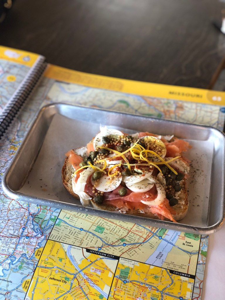 Next, I headed into Oklahoma City. I went to The Jones Assembly per a recommendation from another woman solo traveler, but it didn’t open until 4pm—boo! So, I headed to Elemental Coffee and brought my Atlas with me so I could plan my next stop. After a little while I got a little hungry, so I got some salmon toast and it was the bomb dot com.